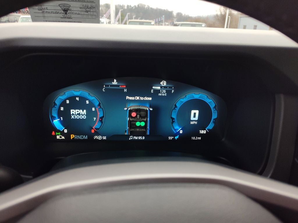 See what's behind you with the back up camera on this 2025 Ford Bronco . Apple CarPlay: Seamless smartphone integration for this model - stay connected and entertained on the go! An off-road package is equipped on this unit. The vehicle offers Android Auto for seamless smartphone integration. Never get into a cold vehicle again with the remote start feature on it. Keep your hands warm all winter with a heated steering wheel in this Ford Bronco . Bluetooth® technology is built into this 1/2 ton suv, keeping your hands on the steering wheel and your focus on the road. When you encounter slick or muddy roads, you can engage the four wheel drive on the Ford Bronco and drive with confidence. It has a V6, 2.7L high output engine. The Ford Bronco projects refinement with a racy metallic gray exterior. The Electronic Stability Control will keep you on your intended path.