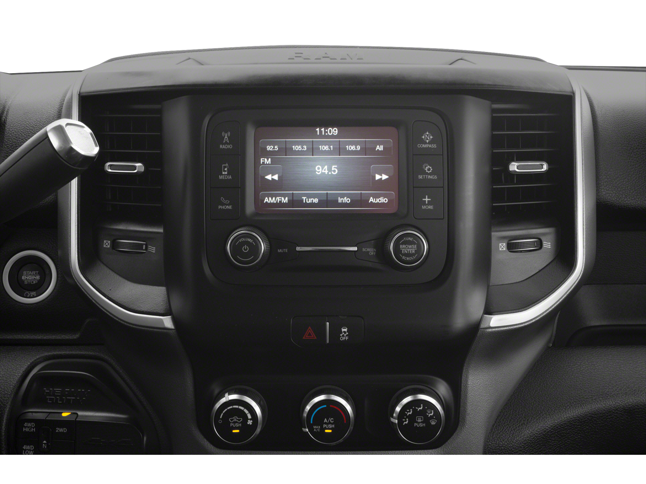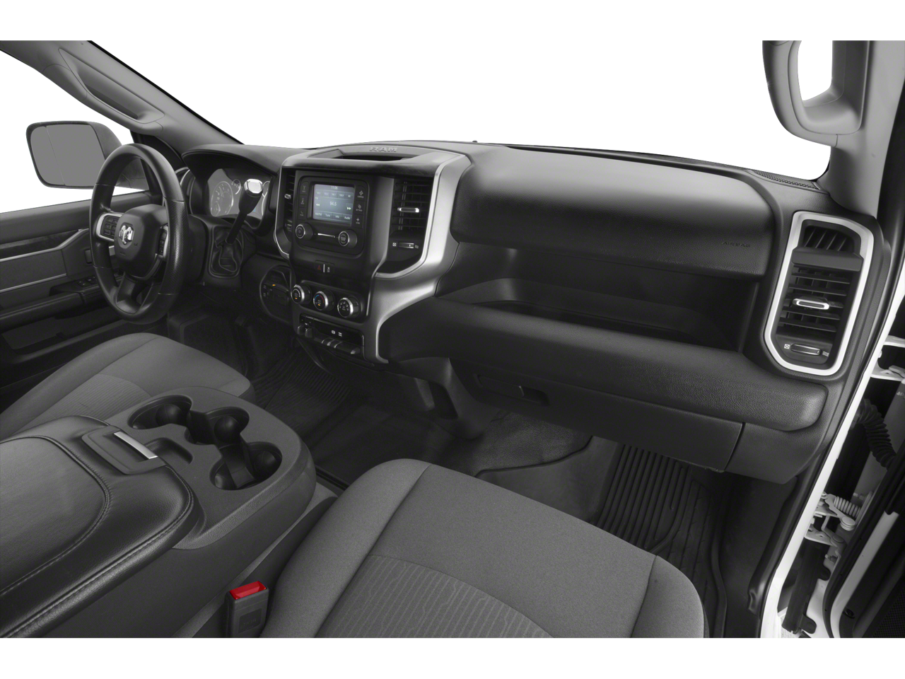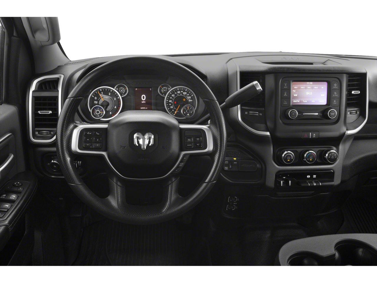 Quick Order Package 2GZ Big Horn. Night Edition: LT285/60R20E OWL On/off Road Tires; Black Exterior Truck Badging; Black Ram Head Tailgate Badge; 20" X 8.0" Black Painted Aluminum Wheels; Gloss Black Grille Billets/accents; Body Color Grille Surround; Black Interior Accents; Black Headlamp Bezels; Painted Front Bumper; Black Tail Lamp Bezels; Painted Rear Bumper; ParkSense Front/rear Park Assist System. Level 1 Equipment Group: Uconnect 4 Radio with 8.4" Display; Locking Lower Glove Box; Rear View Auto Dim Mirror; Power Adjustable Pedals; Leather Wrapped Steering Wheel; Rear Dome with On/off Switch Lamp; Front Fog Lamps; Power Adjust/fold and Heated Black Tow Mirrors; Steering Wheel Mounted Audio Controls; Dual Glove Boxes; Glove Box Lamp; Footwell Courtesy Lamp; Universal Garage Door Opener; Cluster 3.5" TFT Color Display; Power Folding Mirrors; Foam Bottle Insert (door Trim Panel); 2nd Row in Floor Storage Bins; Sun Visors with Illuminated Vanity Mirrors; Big Horn Instrument Panel Badge. Protection Group: Tow Hooks; Transfer Case Skid Plate Shield. Heated Seats and Wheel Group: Heated Front Seats; Leather Wrapped Steering Wheel; Heated Steering Wheel; Steering Wheel Mounted Audio Controls. Uconnect 4 Radio with 8.4" Display. ParkSense Front/rear Park Assist System. Premium Cloth Bucket Seats. Remote Start System. Front Fog Lamps. SiriusXM Satellite Radio. Tow Hooks. Clearance Lamps. **Equipment listed is based on original vehicle build and subject to change. Please confirm the accuracy of the included equipment by calling the dealer prior to purchase.**