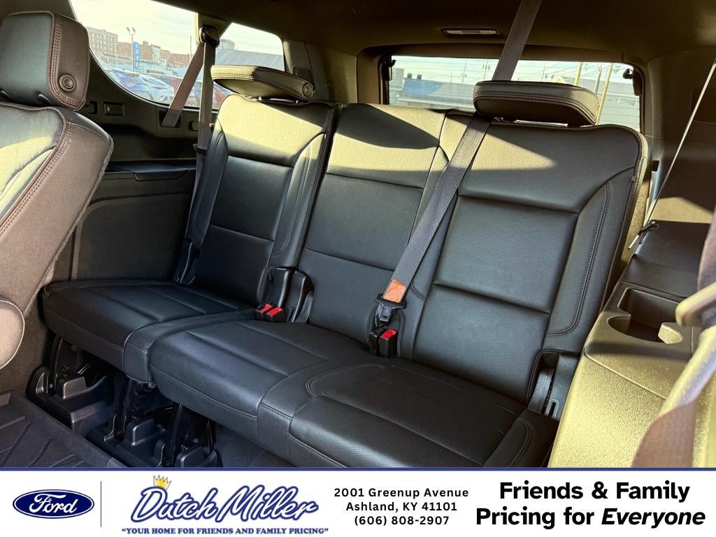 Max Trailering Package. Advanced Trailering Package: Trailer Side Blind Zone Alert; Smart Trailer Integration Indicator; Integrated Trailer Brake Controller; Hitch Guidance with Hitch View. Advanced Technology Package: Super Cruise; Reverse Automatic Braking. Preferred Equipment Group 3LZ: Bright Front and Rear Door Sill Plates; Memory Settings; Perforated Leather Seating Surfaces; Remote Start; 3rd Row 60/40 Power-Folding Split-Bench; Safety Alert Seat; Chrome Door Handles with Body-Color Strip; Hill Descent Control; 6.2L EcoTec3 V8 Engine; Rear Camera Mirror Washer; Inside Rearview Auo-Dimming Rear Camera Mirror; Heated Steering Wheel; LED Daytime Running Lamps; Rear Cross Traffic Alert; Wheels: 22" X 9" Sterling Silver Premium Painted; Driver and Front Outboard Passenger Airbags; Heated Driver and Front Passenger Seats; Wireless Charging; Front Bucket Seats; Universal Home Remote; Color-Keyed Carpeting Floor Covering; Heated 2nd Row Outboard Seats; Hands-Free Rear Power Programmable Liftgate; Chevrolet Infotainment 3 Premium System Radio; 2-Speed Active Electronic Autotrac Transfer Case; 1st and 2nd Row Color-Keyed Carpeted Floor Mats; Enhanced Driver Information Center; Floor Console; Lane Change Alert with Side Blind Zone Alert; Dual Exhaust System; SiriusXM Radio with 360L; HD Surround Vision; Heated and Ventilated Driver and Front Passenger Seats; Wrapped Steering Wheel; Power Tilt and Telescopic Steering Column; 15" Diagonal Multi-Color Head-Up Display; Rear Pedestrian Alert; Bose 10-Speaker Surround with CenterPoint; Magnetic Ride Control Suspension; Infotainment Display; Power Release 2nd Row Bucket Seats; Enhanced Automatic Emergency Braking; 275/50R22SL AS BW Tires; Outside Heated Power-Adjustable Mirrors. Super Cruise. Rear Seat Media System. Dual-Pane Power Panoramic Sunroof. Black Roof Rack Cross Rails. 1st. 2nd and 3rd Row All-Weather Floor Liners (LPO). Front and Rear Black Bowtie Emblems. Reverse Automatic Braking. **Equipment listed is based on original vehicle build and subject to change. Please confirm the accuracy of the included equipment by calling the dealer prior to purchase.**